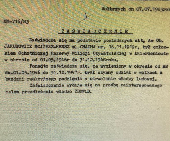 Obywatel Jakubowicz Mojżesz, syn Haima, był członkiem ORMO na terenie miasta Dzierżoniów w okresie od maja 1946 roku do grudnia 1948 roku.
