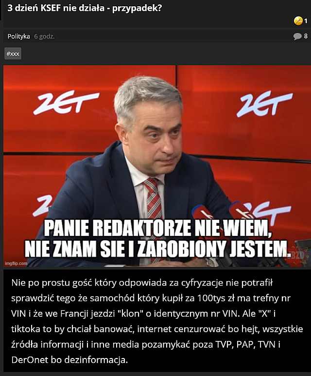 Tym może nikt by się nie przejmował, może nawet nikt by tego nie zauważył, gdyby nie obawa, że wraz z panem Szymonem z „Polski 2050” może odejść grupa posłów – może nawet w liczbie kilkunastu. W tym momencie przypominamy sobie uwagę Winstona Churchilla z czasów II wojny światowej, że nigdy jeszcze tak wielu nie zawdzięczało tak wiele, tak nielicznym. Churchill mówił o lotnikach – ale myślę, że tę uwagę można by zastosować również do tej grupy posłów, która może opuścić szeregi partii Polska w2050 z panem Szymonem. Gdyby bowiem kilkunastu posłów wyszło z koalicji 13 grudnia, to vaginet obywatela Tuska Donalda mógłby utracić większość parlamentarną. Wtedy reszta poczekałaby, aż Jarosław Kaczyński wyzdrowieje i zaraz złożyłaby wniosek o votum nieufności dla rządu, który zostałby obalony kilkoma głosami.