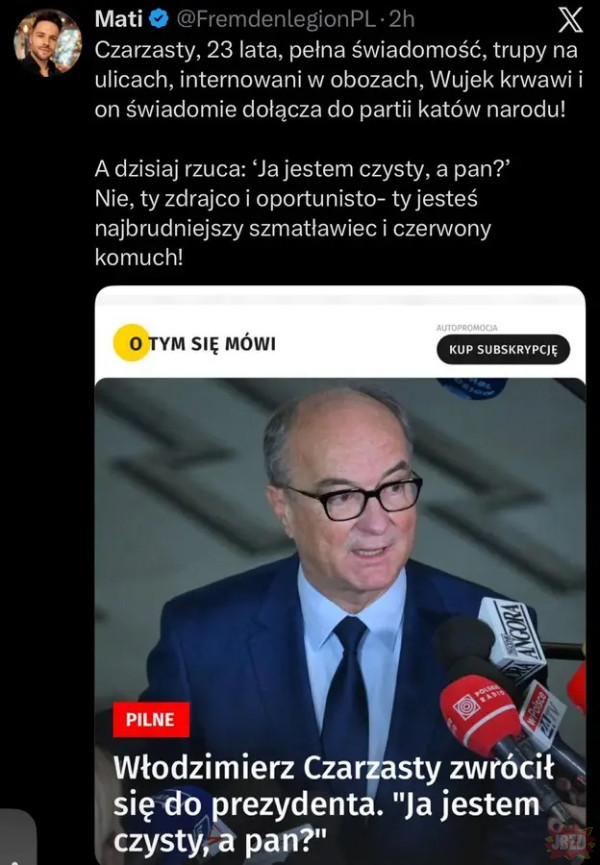 Jak się okazuje, współczesna żydokomuna w Polsce po przewodnictwem pana red. Michnika, który stalinowskie przykazania wyssał z mlekiem matki i mleczem ojca, kontynuuje tę bolszewicką linię w najlepsze. Kontynuacja jest zatem większa, niż mogłoby się wydawać i kolejne pokolenie żydokomuny próbuje wdeptać w ziemię kolejne pokolenie polskich patriotów. Jednak poza przysłaniem funkcjonariuszy Propaganda Abteilung pod przewodnictwem zasłużonego w podobnych operacjach i znanego z żarliwego obiektywizmu pana Wojciecha Czuchnowskiego, żadnych przeszkód żydokomuna na razie nie stawiła. Najwyraźniej czeka na ruchy ze strony siepaczy obywatela Żurka Waldemara, by samego Grzegorza Brauna wtrącili do lochu, a Konfederację Korony Polskiej – zdelegalizowali.