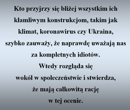 Do czasów nastania Trumpa szliśmy po równi pochyłej w dół tego scenariusza. Mniej uważni mogli to zauważyć dopiero w czasach pandemii kowidowej, dla tych, których przegapili nawet ten reset „nowej normalności” nie masz już nadziei na przebudzenie. Ci pójdą na rzeź podśpiewując jak Izraelici w schronach.