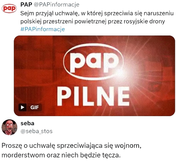 „Jeżeli widzicie to wideo, to znaczy, że zostałem porwany przez siły okupacyjne Izraela na międzynarodowych wodach podczas pokojowej misji humanitarnej Global Sumud Flotilla. Gorąca prośba! Wstawcie się za mną i moimi towarzyszami u polskich władz. Panie Premierze, Panie Ministrze Spraw Zagranicznych – z całego serca i najprościej, jak tylko potrafię, proszę Was: zróbcie wszystko, aby wszyscy członkowie Flotylli z polskiej delegacji wrócili bezpiecznie do domu. Niech żyje wolna Palestyna, niech żyje wolna Polska. All eyes on Gaza!”