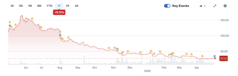 Meanwhile, Moderna’s stock price has been devastated, down a shocking 75% in one year. You can also observe how the stock briefly blipped upwards when the big contract was announced in January.