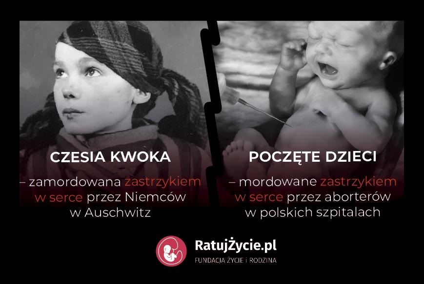 Jak Czesia Kwoka i jak św. Maksymilian – tak samo brutalnie są dziś traktowane maleńkie dzieci. Niewinne, chcące żyć, dostają śmiertelny zastrzyk w serce, aby nie urodziły się z aborcji żywe. Tak zginął mały Felek w Oleśnicy, tak w 2025 roku zginęło pięcioro dzieci w szpitalu na Zaspie w Gdańsku. Ich niemy krzyk to wezwanie dla nas: nie zapomnijcie o nas, powiedzcie ludziom, co nam zrobiono.
