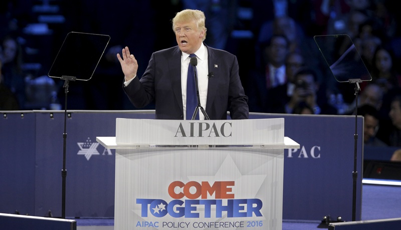 (21 marca 2016 roku. Przemówienie kandydata na fotel prezydenta USA Donalda Trumpa podczas konferencji amerykańsko-żydowskiej organizacji AIPAC. Fot. Joshua Roberts / Reuters / Forum)
