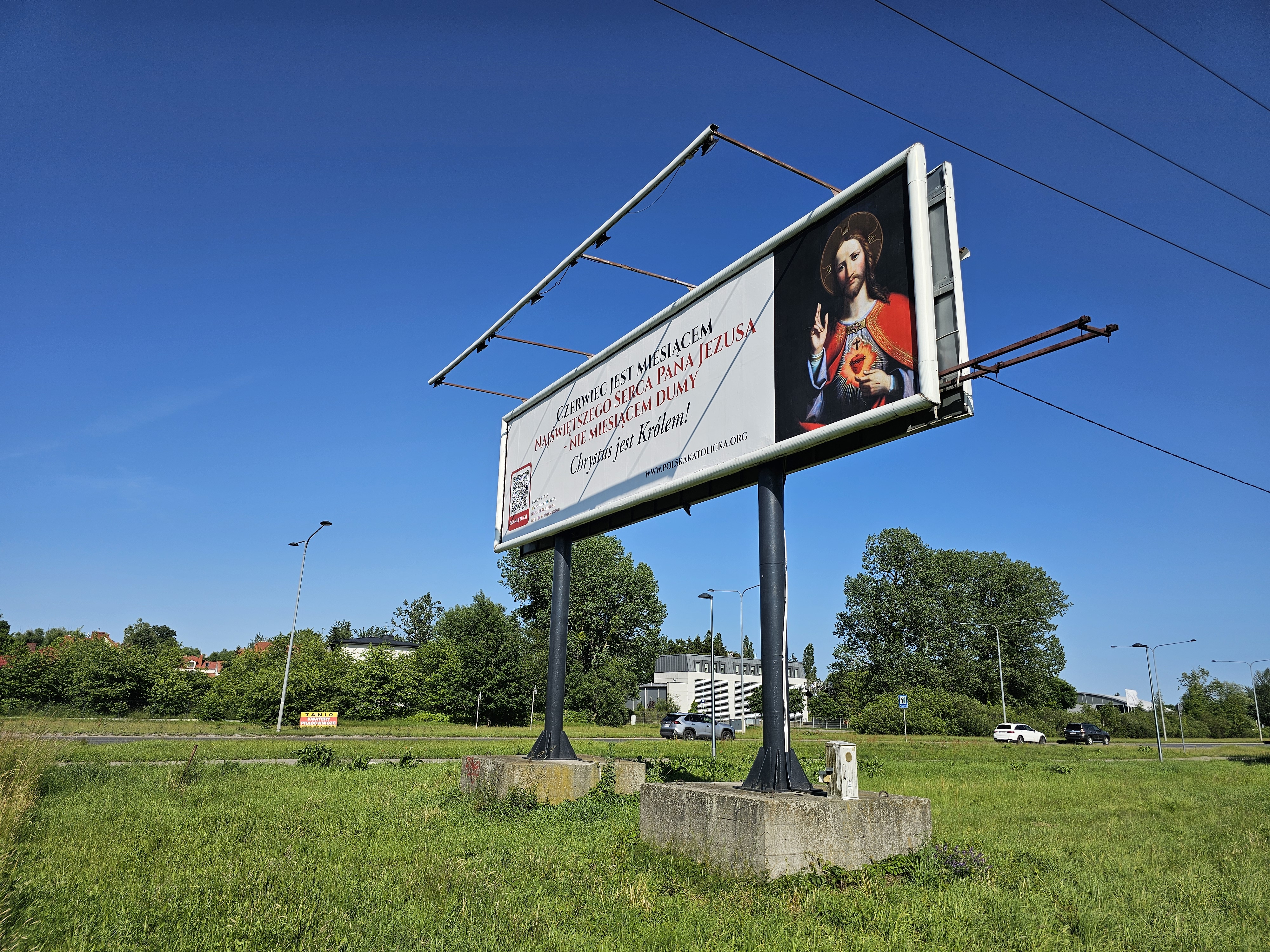 Dzięki wsparciu naszych darczyńców dwa lata z rzędu udało nam się organizować kampanię billboardową ku czci Najświętszego Serca Jezusa. W 2024 roku 16 wielkich wizerunków Serca Jezusa zawisło w centrum Warszawy, przywracając pamięć o Tym, który jest Miłością. W tym roku tylko dzięki ogromnej hojności serc gorliwych katolików w naszym kraju udało się o wiele więcej: 12 miast, 25 bannerów i billboardów z Najświętszym Sercem Jezusa, tysiące dotkniętych zaproszeniem do wynagrodzenia za grzechy, które uderzają w Boże Serce.