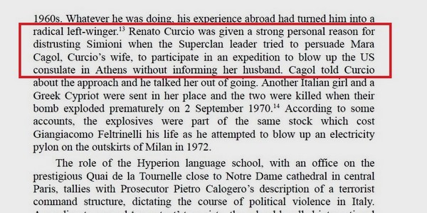 I teraz, co najciekawsze, ów hipotetyczny agent CIA chciał przekonać żonę założyciela Brygad Renato Curcio, Marę Cagol, do wysadzenia w powietrze konsulatu Stanów Zjednoczonych w Atenach. Ostatecznie do akcji wysłano innych terrorystów (Cagol za namową Curcio się nie zgodziła), którzy 2 września 1970 roku zginęli, gdy bomba wybuchła przedwcześnie.