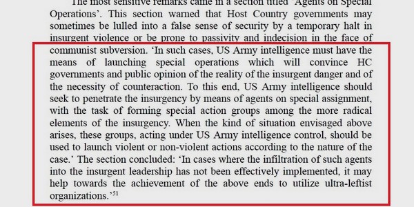 „Wywiad armii amerykańskiej musi dysponować środkami umożliwiającymi przeprowadzenie operacji specjalnych, które przekonają rządy krajów przyjmujących i opinię publiczną o realnym zagrożeniu ze strony rebeliantów i konieczności podjęcia działań przeciwnych. W tym celu wywiad armii amerykańskiej powinien dążyć do przeniknięcia do szeregów rebeliantów za pomocą agentów wykonujących specjalne zadania, których zadaniem będzie utworzenie specjalnych grup działania wśród bardziej radykalnych elementów rebelii. W przypadku wystąpienia sytuacji opisanej powyżej grupy te, działające pod kontrolą wywiadu armii amerykańskiej, powinny zostać wykorzystane do podjęcia działań zbrojnych lub pokojowych, w zależności od charakteru sprawy […] W przypadkach, gdy infiltracja takich agentów do kierownictwa rebeliantów nie została skutecznie przeprowadzona, osiągnięcie powyższych celów może ułatwić wykorzystanie organizacji skrajnie lewicowych.”