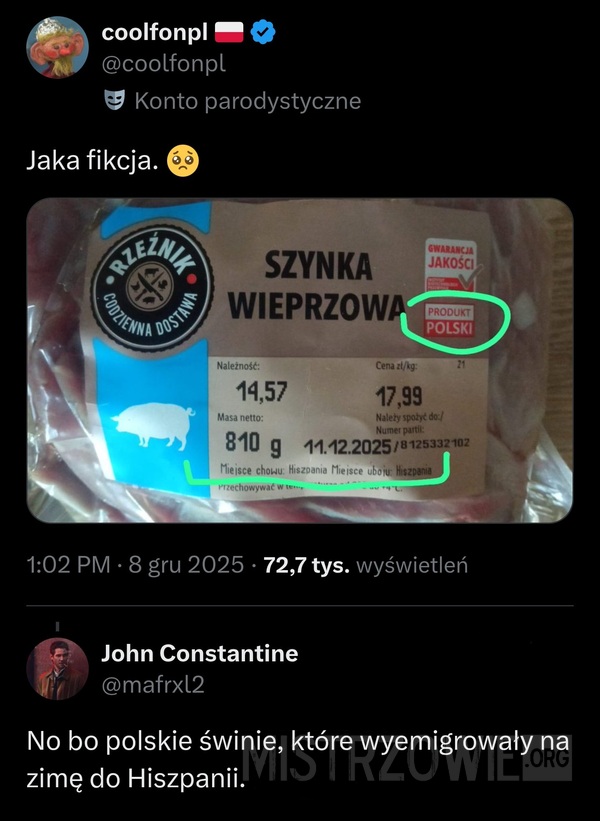 Polskie świnie wyemigrowały do Hiszpanii. MEM-y VI. Opublikowany 2025-12-15 przez Mirosław Dakowski ———————————– ————————- —————————————– ————————– ————————————