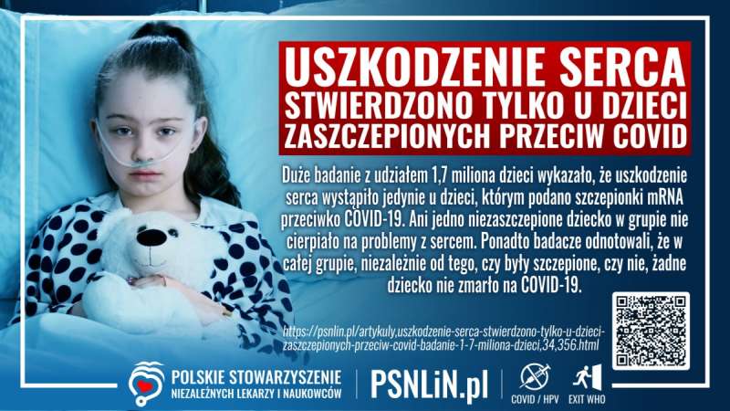 Duże badanie z udziałem 1,7 miliona dzieci wykazało, że uszkodzenie serca wystąpiło jedynie u dzieci, którym podano szczepionki mRNA przeciwko COVID-19. Ani jedno niezaszczepione dziecko w grupie nie cierpiało na problemy z sercem. Ponadto badacze odnotowali, że w całej grupie, niezależnie od tego, czy były szczepione, czy nie, żadne dziecko nie zmarło na COVID-19.