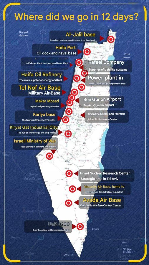 Mimo usilnych starań izraelskich cenzorów, aby ukryć zniszczenia, jakie Iran wyrządził Izraelowi gradem pocisków balistycznych podczas wojny 12-dniowej, dostępne już są informacje, które obalają mit, że Izrael miał niezwyciężoną obronę powietrzną. Ta mapa ujawnia miejsca, które były celem ataku Iranu. Na podstawie nagrań wideo z ataków w Hajfie i Tel Awiwie uważam, że mapa dokładnie przedstawia ogromną skalę irańskiego ataku.