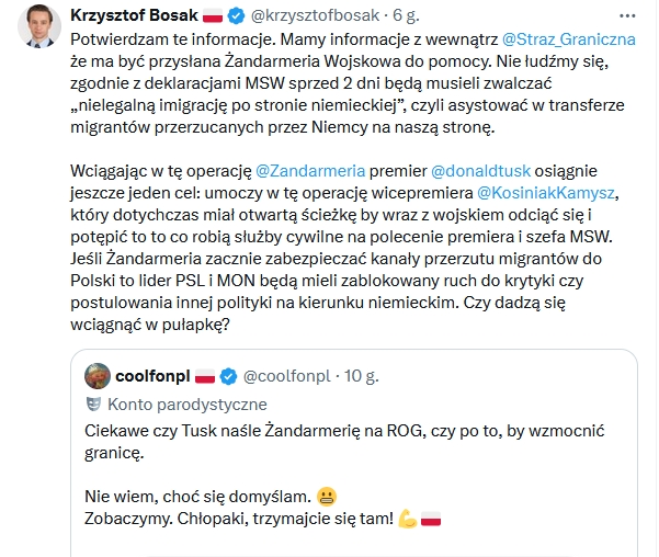 Drugi, ciekawy powód zadowolenia kanclerza z ruchu Tuska jest jeszcze bardziej wstrząsający. Otóż Merz powiedział, że to dobry ruch, bo – uwaga! – Polacy wesprą Niemców w przesiewaniu ruchu… Z Polski, nie DO Polski. I Tusk to formalnie potwierdził (17:00). A więc cały pogrzeb na nic. Granice zostaną zamknięte nie po to, by zluzować ROG, nie po to by wyłapywać wątpliwy eksport ludzi z Niemiec, ale po to, by dokładniej patrzeć kto wyjeżdża od nas.