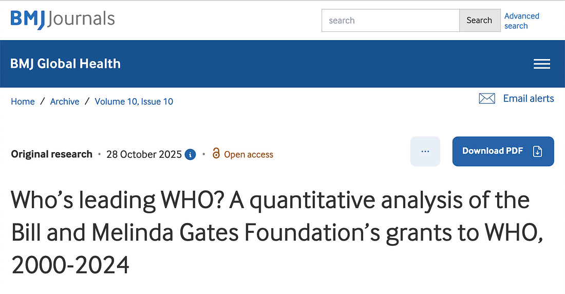 The British Medical Journal, otherwise known as BMJ, just published a peer-reviewed study titled “Who’s leading WHO? A quantitative analysis of the Bill and Melinda Gates Foundation’s grants to WHO, 2000-2024 (ref).” Note that the authors have no affiliation to BMJ, the WHO, or Bill Gates, but are academics centered in the UK.
