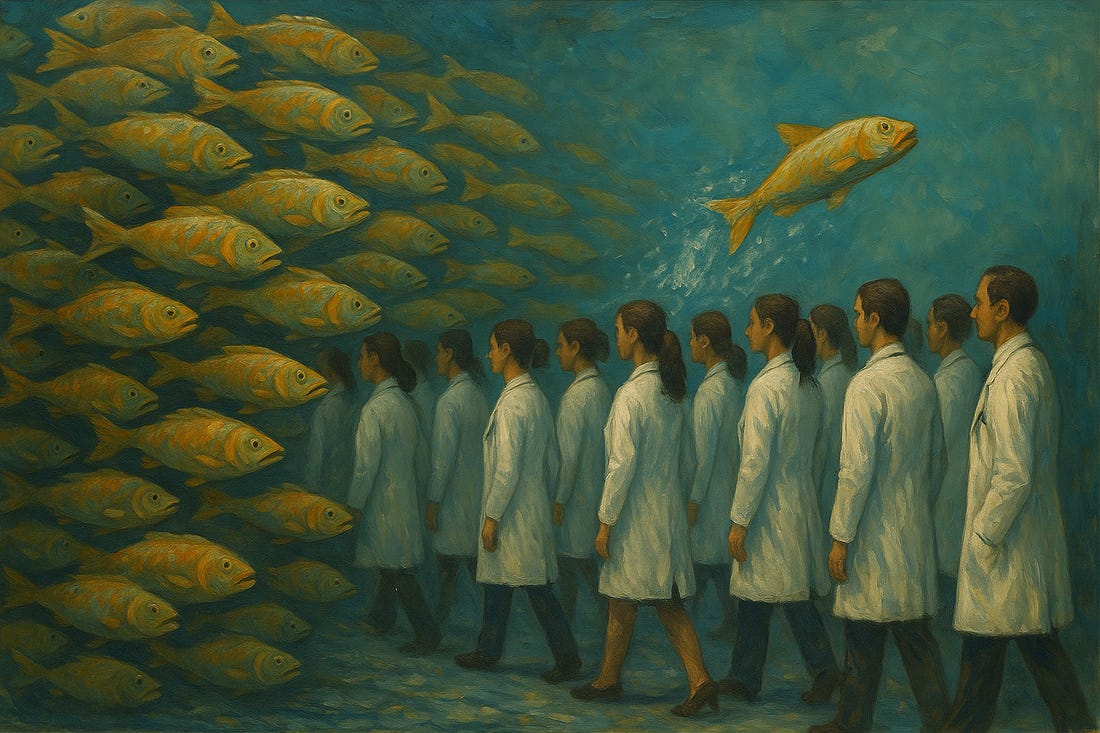 But in softer, more interpretive areas– especially those entangled with human behavior, hormones, or institutional consensus– medicine shifts. It gets personal, tribal, even theatrical. One moment, doctors are confidently headed in one direction; then comes a splash in the water– and the whole “school” veers. This isn’t clinical reasoning– it’s choreography, and fishy at that.