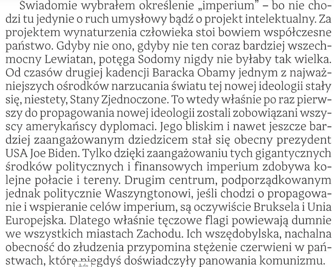 Paweł Lisicki: Jeśli szukałbym miejsca, które, ja zresztą o tym piszę w książce, które można by uznać za centrum i politycznym i ideologicznym, no to wydaje mi się jednak, że trudno znaleźć inne niż pewnie Nowy Jork albo Stany Zjednoczone. To jest w tej chwili w sensie i politycznym, i ideologicznym główny wehikuł nakręcający tę ideologię. No oczywiście nie mniejsze znaczenie albo z polskiego punktu widzenia nie mniej istotne znaczenie stanowi Bruksela czy Unia Europejska…