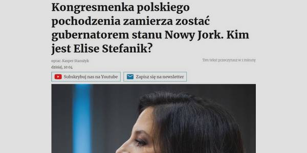 Najnowszym przykładem „Polki”, która może osiągnąć sukces za granicą, jest Elise Stefanik. Media piszące w języku polskim, od lewa do prawa, piszą od wczoraj o tym, że kongresmenka pochodzenia polskiego ma szansę osiągnąć sukces za oceanem, zostając gubernatorem jednego z amerykańskich stanów. Stanu Nowy Jork.