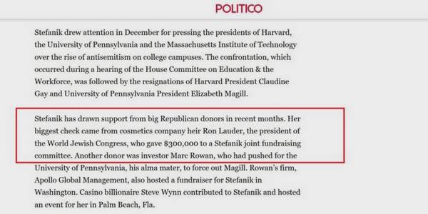 „W ostatnich miesiącach Stefanik uzyskała wsparcie od dużych darczyńców republikańskich. Największym darczyńcą był spadkobierca firmy kosmetycznej Ron Lauder, prezes Światowego Kongresu Żydów, który przekazał 300 000 dolarów na rzecz wspólnego komitetu zbierającego fundusze dla Stefanik” – pisało w kwietniu 2024 roku „Politico”.