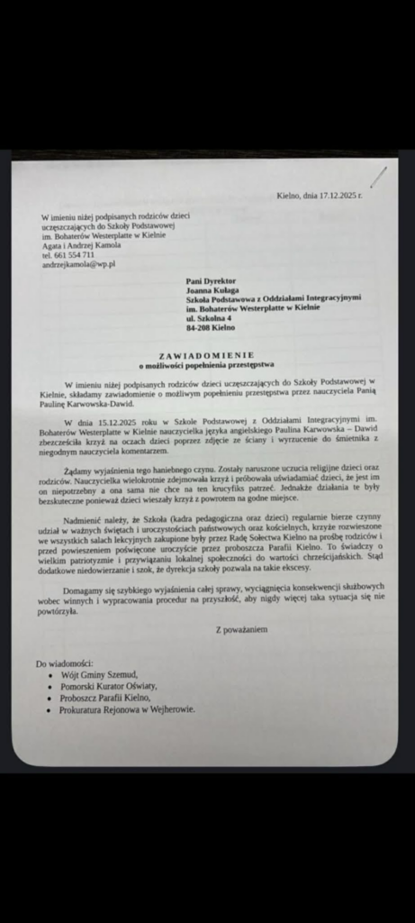Jedna nauczycielka jawnie profanuje krzyż wbrew dzieciom które ten krzyż zrobiły na drukarce 3D i go powiesiły w klasie. Nauczycielka która wrzuciła go do kosza uczy angielskiego. W tej klasie regularnie ktoś usuwa godło państwowe i nie wiadomo kto bo nikogo nie złapano. Ale krzyż wrzuciła do kosza przy uczniach.