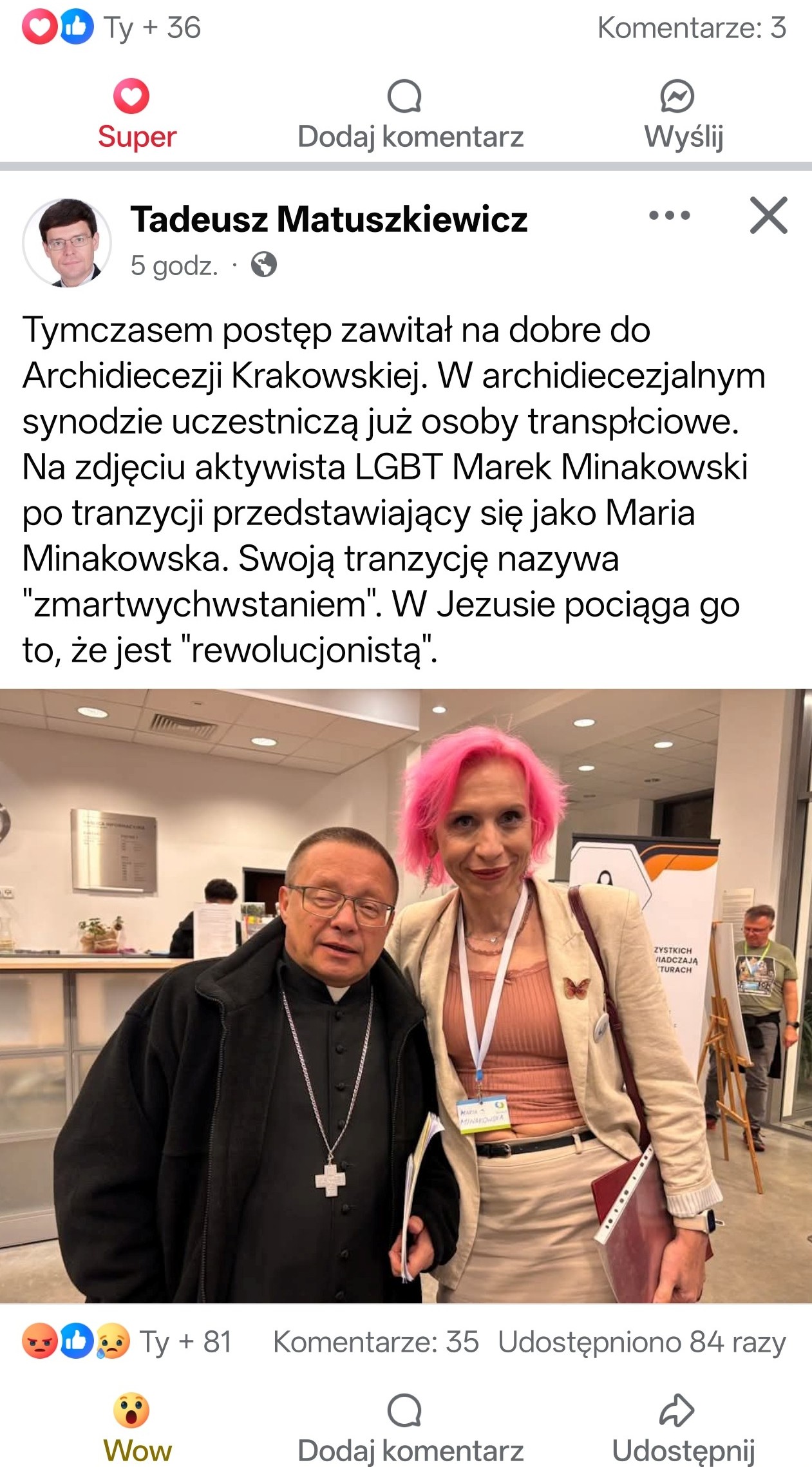 Oto nasz ulubiony hierarcha na serdecznej fotce z różanowłosą (-ym?) działaczką (-czem) LGBT a zarazem gościem synodu, panią (panem) Marią vel Markiem Minakowskim (- ską).