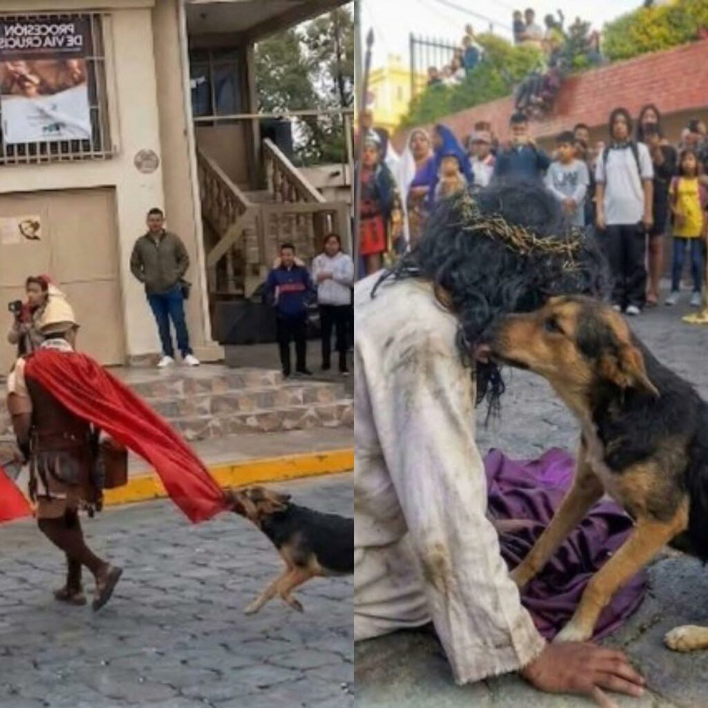 Na miejsce wszedł bezdomny pies. Nie wiedział, że to tylko przedstawienie. Gdy zobaczył mężczyznę niosącego krzyż, otoczonego przez „żołnierzy”, którzy go popychali, zareagował instynktownie. Zaczął szczekać, podbiegać i próbował ich odganiać, jakby chciał przerwać to, co widział.