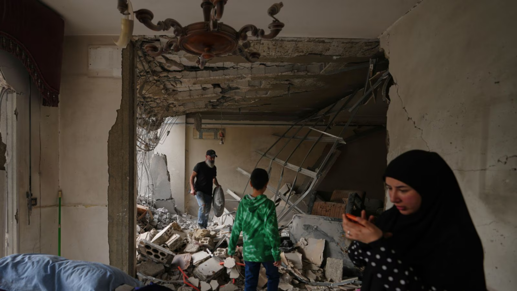 - Fadi Al Zein (po lewej), który stracił oba domy w izraelskich atakach w swojej wiosce Khiam i Dahiyeh, przeszukuje gruzy swojego mocno zniszczonego domu, podczas gdy w pobliżu stoi dziecko, na południowych przedmieściach Bejrutu w Libanie. (Zdjęcie: AP)