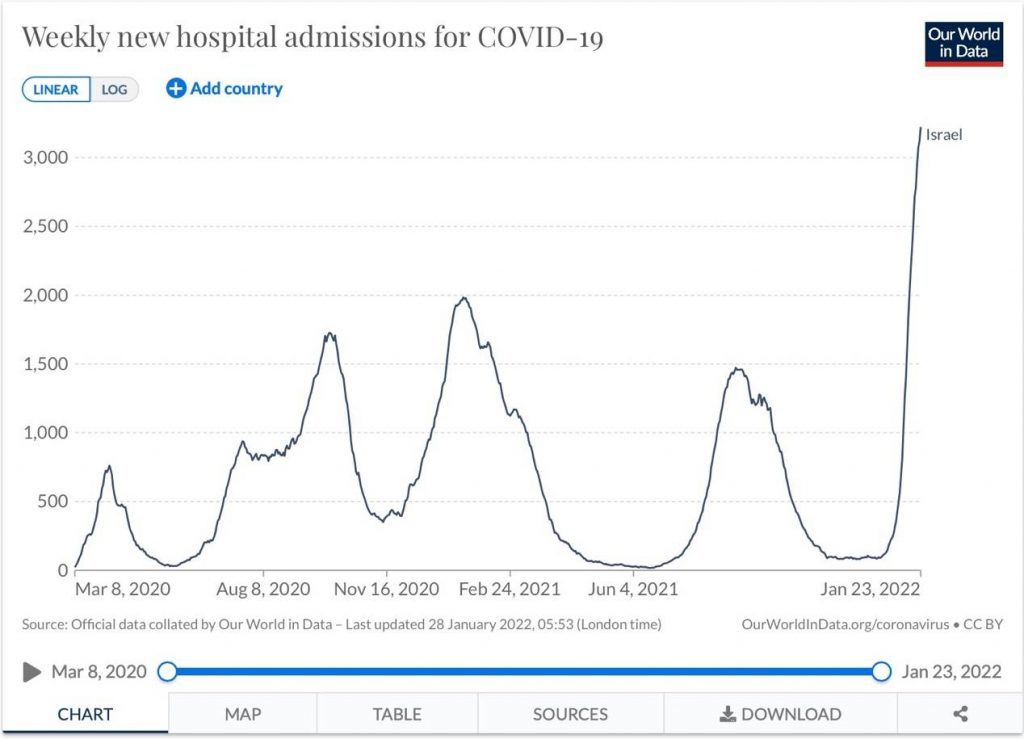 Mimo że ludność Izraela jest w dużym procencie zaszczepiona i po dawce przypominającej [boostered], w kraju pojawia się bezprecedensowa liczba przypadków. 25 stycznia Izrael zgłosił ponad 101 905 przypadków, czyli ponad 10 razy więcej niż przed szczepieniem. Innymi słowy, teraz, gdy Izraelczykom wstrzyknięto masowo szczepionki mRNA, liczba przypadków u nich wzrosła o ponad 1000 procent.