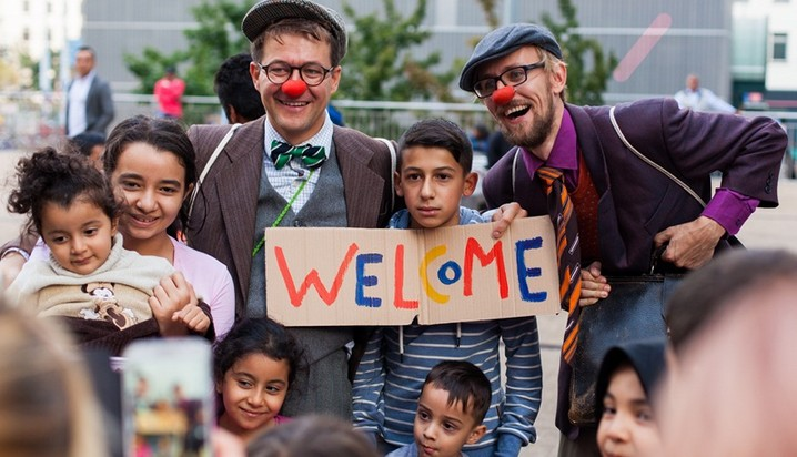 (Wrzesień 2015 roku, akcja „Klauni dla uchodźców” na wiedeńskim dworcu kolejowym Wien Westbahnhof. Fot. Petra Rautenstrauch / Anzenberger / Forum)