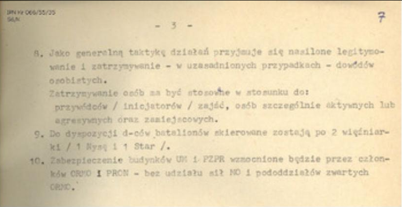 Jako generalną praktykę przyjmuje się nasilone legitymowanie i zatrzymywanie – w uzasadnionych przypadkach – dowodów osobistych. (…) Do dyspozycji dowódców batalionów skierowane zostają po 2 więźniarki /1 Nysę i 1 Star/. Zabezpieczenie budynków UM i PZPR wzmocnione będzie przez członków ORMO i PRON – bez udziału sił MO i poddodziałów zwartych ORMO.