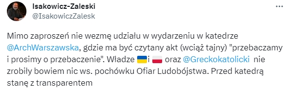 W piątek 7 lipca w 80 rocznicę Rzezi Wołyńskiej w naszej archikatedrze odbędzie się Nabożeństwo Przebaczenia i Pojednania polsko- ukraińskiego z udziałem zwierzchnika Ukraińskiego Kościoła Greckokatolickiego arcybiskupa większego kijowsko-halickiego Światosława Szewczuka oraz arcybiskupa metropolity poznańskiego, przewodniczącego Konferencji Episkopatu Polski. W czasie liturgii zostanie podpisane wspólne orędzie Kościoła rzymsko-katolickiego w Polsce i Kościoła greckokatolickiego. Serdecznie zapraszamy do udziału w uroczystości.Pojednania?Znów będzie przebaczamy i prosimy o przebaczenie.Biedny nasz naród i tak ogłupiają nas bez końca w każdej dziedzinie.