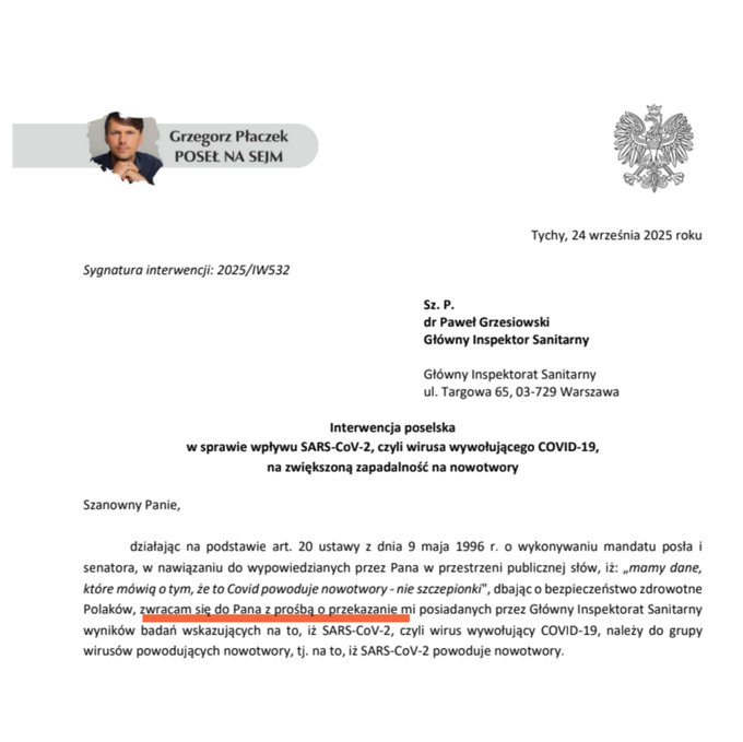 Poseł Konfederacji Grzegorz Płaczek poinformował, że zgodnie z odpowiedzią z Głównego Inspektoratu Sanitarnego nie ma danych, wedle których to Covid-19 miał powodować raka, a nie szczepionki. Jak podkreślił poseł, szef GIS znany z radykalnego covidiańskiego przekazu Paweł Grzesiowski miał twierdzić wcześniej, że „mamy dane, które mówią o tym, że to COVID powoduje nowotwory – nie szczepionki”.